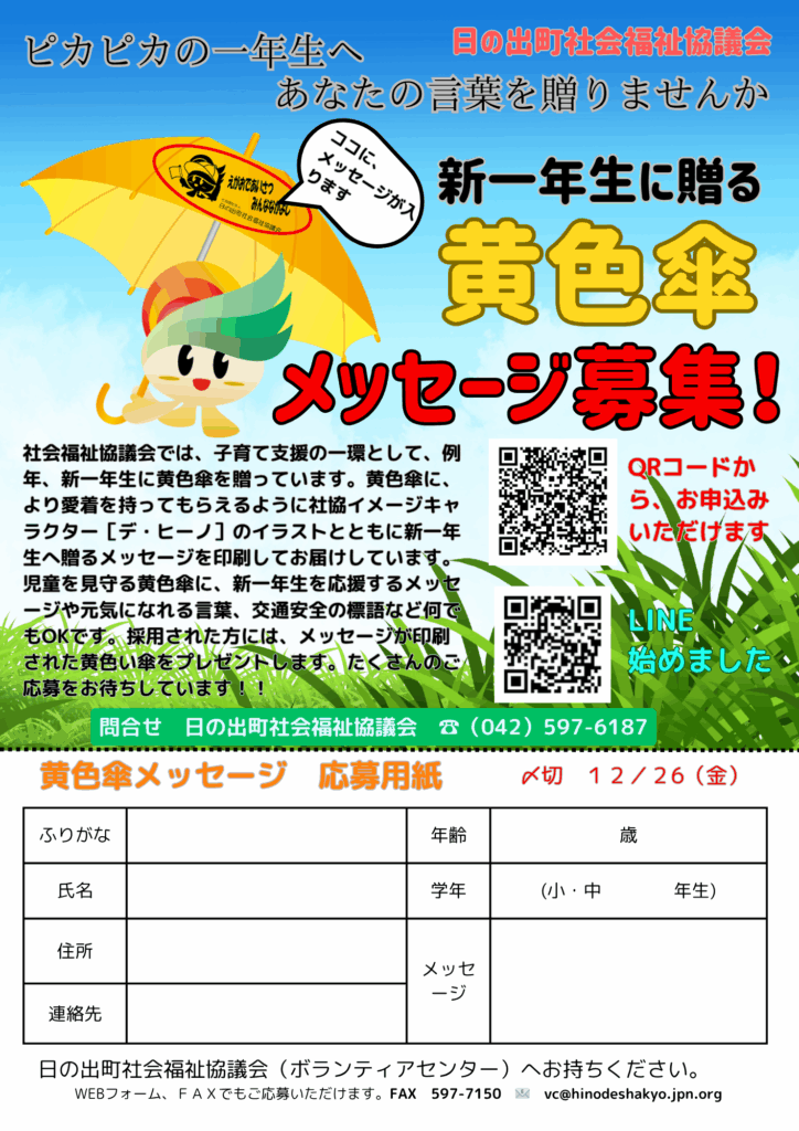 子育て支援事業では例年、新1年生に黄色い傘を贈っています。より愛着をもって使ってもらえるように社協のイメージキャラクターの「デ・ヒーノ」のイラストと共に新1年生へ贈るメッセージを印刷して届けることにしました。