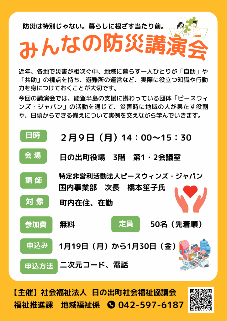 近年、各地で災害が相次ぐ中、地域に暮らす一人ひとりが「自助」や「共助」の視点を持ち、避難所の運営など、実際に役立つ知識や行動力を身につけておくことが大切です。今回の講演会では、能登半島の支援に携わっている団体「ピースウィンズ・ジャパン」の活動を通じて、災害時に地域の人が果たす役割や、日頃からできる備えについて実例を交えながら学んでいきます。